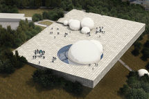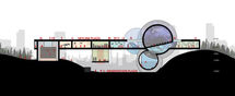 The Science Museum Competition project translates the logic and systems of nature into architecture. A suspended box intersects the site’s topography, splitting open as it meets the hills and revealing its interior through a series of colorful forms and spatial sequences. These fissures narrate scientific phenomena within a unified composition. The design creates two urban plazas: the upper aligns with the ground level, offering sky and city views, while the lower plaza opens toward the aquarium and other exposed spaces beneath the box. Circulation unfolds as a labyrinthine path through flexible galleries, encouraging exploration and discovery. At the heart of the museum, spherical volumes house the aquarium and planetarium, while supporting functions—including a children’s gallery, library, auditorium, shop, and café—are integrated along the main route, blending program and spatial experience.